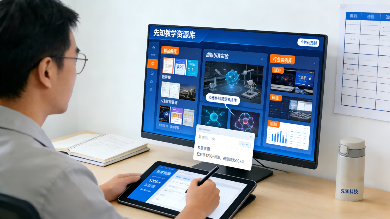 先知科技 AI 智慧课堂方案内置海量优质教学资源库,涵盖精品课程、虚拟仿真实验、行业案例库等内容,并支持资源的个性化定制与共享: