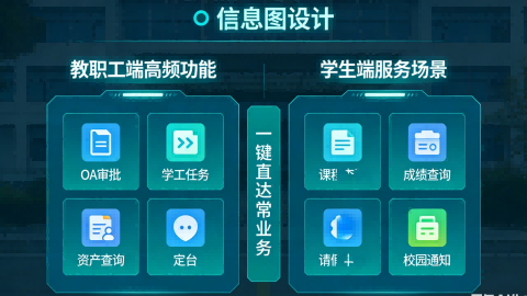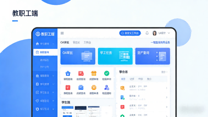 - 教职工端:集成 OA 审批、学工任务、资产查询等高频功能,支持自定义工作台,一键直达常用业务,减少操作路径;